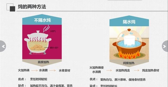 作为烹饪术语的“炖”,是指把食物原料加入汤水及调味品,先用旺火烧沸,然后转成中小火,长时间烧煮的烹调方法。其中分为:隔水炖和不隔水炖。不隔水炖法是将原料器皿内,加调味品和水,加盖,直接放在火上烹制。隔水炖法则是将原料放入瓷制、陶制的内胆里,加调味品与汤水,封口后将内胆放入锅中,再在锅中加水,以不没过内胆为宜,盖紧锅盖,以火对锅内的水进行加热,再通过水对内胆里的食材煮熟。因为炖盅浸在水中,因此隔水炖受热更均匀;炖盅的密封性很好,汤汁不易挥发;并且因为是利用沸腾的水来加热食材,所以热力均衡,炖出的汤汁清澈、浓醇,炖品的营养保持较好,更能保证食材的原汁原味。而其缺点就是整个炖煮的时间较长。